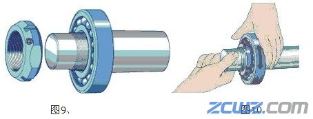 10、 轴和轴承箱(座)还装入:用矿物油细微光滑轴承的内孔、外圆外表。确保轴和轴承箱(座)经由调整以使轴承装置后与轴垂直。装置时,运用适宜的套筒还施力在表里圈(图8)。
