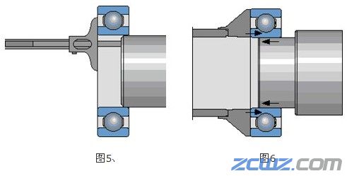 8、 轴为过盈共同:用矿物油细微光滑轴承的内孔。装置时,确保轴承装置后与轴垂直(图5),运用适宜的套筒施力在内圈(图6)。