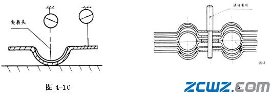 (9) 钢球在保持架中的径向游隙ε的测量,采用专用游隙装置(见图4-12)和百分表测量ε值。测量ε值,首先将保持架装在游隙装置上(有三个销钉定位),各球兜孔装入被检型号的的成品钢球(尺寸偏差不大于0.005mm),然后用百分表测量钢球在保持架中的径向游动量(表尖对准钢球中心,径向往复推动钢球),对该组保持架的每个球兜逐个进行测量一遍,然后将一片保持架固定,另一片依顺序变换位置重新组合后对每个球兜逐个测量一次为二遍,如此进行至n2次的总数中,任何一次测量数值,不应超出工艺文件规定的要求(n为球兜数)。