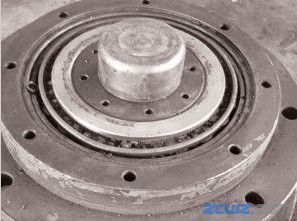 7、按对角顺序依次锁紧图中的七颗螺栓,即可将行走轴承座及轴承一并拉出,把行走轴承座翻转放平后,即可更换型号为φ180×220×18的骨架油封。