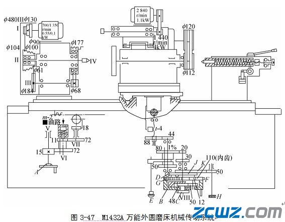 砂轮架主轴的运动是由砂轮架电动机(1440r/min,4kW)经4根V带直接传动的,砂轮主轴的转速达到1670r/min的高转速。