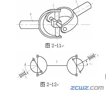 如图2-11所示,万向联轴器由两个固定在轴端的主动叉1和从动叉3以及一个十字柱销2组成。由于叉形零件和销轴之间构成转动副,因而允许两轴之间有较大的角偏移。角偏移可达 。对于图示的单个万向联轴器,主动叉1以等角速度 回转时,从动叉3的角速度 将在 范围内作周期性变化,引起动载荷。为使 ,可将万向联轴器成对使用(如图2-12所示),且应满足三个条件:①主、从动轴与中间轴夹角相等,即 ;②中间轴两端的叉形零件应共面;③主、从动轴与中间轴的轴线应共面。万向联轴器的特点是径向尺寸小,适用于联接夹角较大的两轴。
