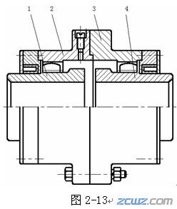 如图2-13所示,齿式联轴器由两个带外齿的半联轴器1、4分别与主、从动轴相联,两个具有内齿的外壳2、3用螺栓联接,利用内、外齿啮合以实现两轴的联接。为补偿两轴的综合偏移,轮齿制成鼓形,且具有较大的侧隙和顶隙。齿式联轴器啮合齿数多,传递转矩大,具有良好的补偿综合偏移的能力,且外廓尺寸紧凑,但成本较高。齿式联轴器应用广泛,适用于高速、重载、启动频繁和经常正反转的场合。