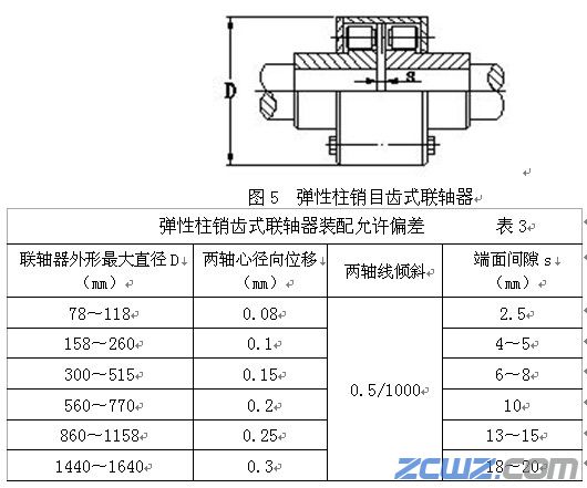四、 弹性销轴齿式联轴器(图5)装配时,两轴心径向位移、两轴线倾斜和端面间隙的允许偏差应符合表3的规定。