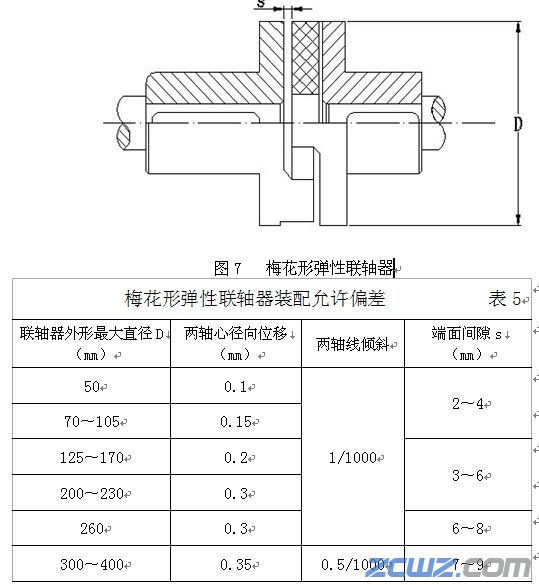 六、 梅花形弹性联轴器(图7装配时,两轴心径向位移、两轴线倾斜和端面间隙的允许偏差应符合表5的规定。