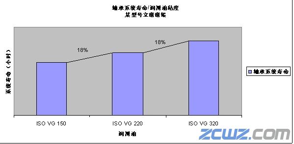 320)做分析,通过比较其分析寿命,可以说明润滑油粘度对轴承工作寿命的重要影响。如下图2所示,润滑油粘度每提升一个级别,磨辊轴承的系统寿命提高18%左右。由此可见,通过采用粘度较高的润滑油来改善轴承寿命,其效果还是很明显的。在工作载荷偏大的应用中,采用粘度相对高的润滑剂对提高轴承性能尤为重要。