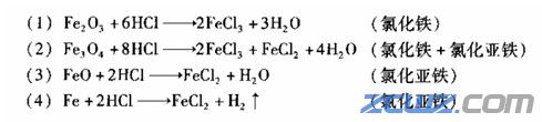 在盐酸作为酸溶液时,在带钢进入酸溶液中主要发生以下几个化学反应:
