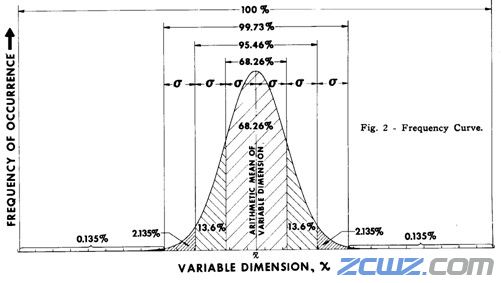 按正态分布特点,大约99.73%的值将落在平均值处±3σ区间内(见图二),西格玛(σ)指的是标准偏差,反映了数据的离散程度,即实际加工尺寸的波动范围的大小。如果在实际生产中,再加以推行六西格玛精益生产管理方式,那么将会进一步提高零件合格率和质量稳定性。图纸上要求的零件尺寸公差范围反映的是设计要求,也可以理解为客户要求。在实际生产过程中,零件的实际加工尺寸在规定公差范围内的波动情况和均值分布位置反映了加工精度和制程质量管理能力的好坏。在六西格玛精益生产管理中,由于加强了零件加工过程的质量控制,使σ值和均值分布位置(图一中的μ)均可以按最终产品要求进行及时调整,提高了加工精度,减少了尺寸波动性。结合正态分布特点,当零件尺寸在设计公差范围内有部分尺寸段无法满足最终产品要求时,运用6σ生产管理,在不提高设计要求的情况下,可使99.73%的零件加工尺寸符合最终使用要求。基于此理论,铁姆肯公司的Set-Right™技术也要求所有轴承安装系统的零件都要进行6σ生产控制,使最终装配后99.73%的轴承系统内零件尺寸累积公差(轴承系统安装游隙)在6σ的范围之内,并且符合正态分布,使大部分轴承系统游隙围绕要求范围的中间值波动。如果σ(标准偏差)值越小,说明生产过程越稳定,产品尺寸变化越小,最终游隙变化范围也越小,更有利于大多数轴承在疲劳寿命高的游隙范围内运行。如图二所示。