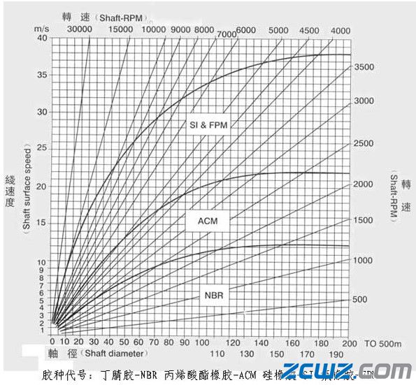 1、轴的表面线速度:在同一直径条件下,不同材料制造的油封,适应轴面旋转线速度的能力不同,其关系如下图所示。油封使用的线速度范围一般小于15m/s, 下图给出的容许的轴的表面线速度是参考值,满意的润滑和良好的散热条件才是决定性因素。相应较低的数据,适用于更为苛刻的条件。