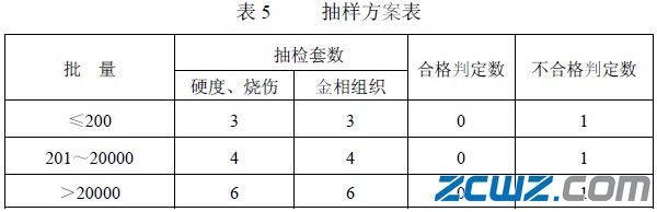 2.2 轴承内、外套圈硬度、金相组织、工作面烧伤的抽检和判定按表5 规定。