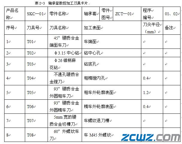 将所选刀具参数填入表2-3轴承套数控加工刀具卡片中,以便于编程和操作管理。