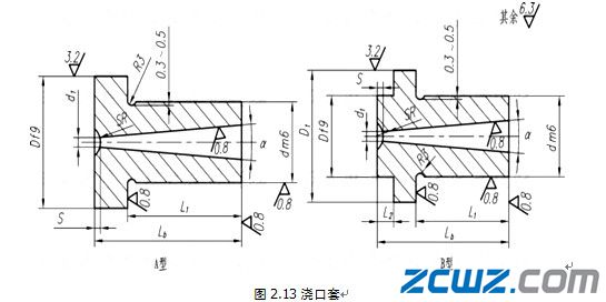 常见的浇口套有两种类型,如图2.13所示的A型和B型。一般采用碳素工具钢T8A制造,局部热处理,硬度HRC57左右。